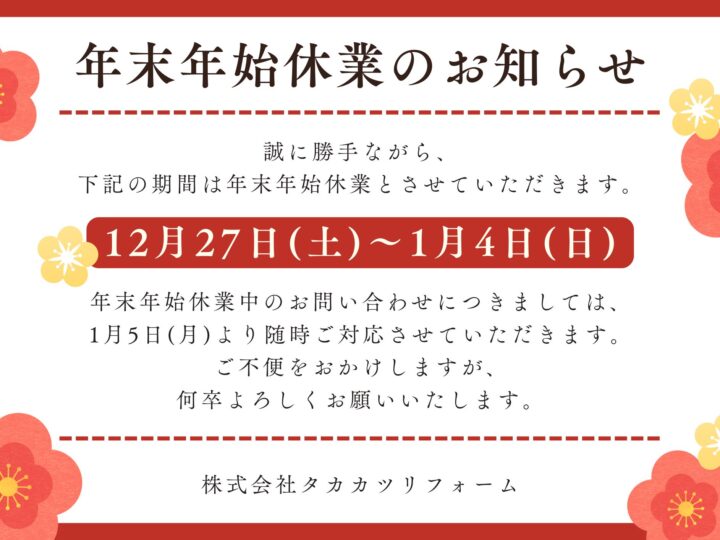 誠に勝手ながら以下期間につきまして全店年末年始休業とさせていただきます 〔 2025/12/27(土)~2026/01/04(日) 〕 お問い合わせなどにつきましては2026/01/05(月)より順次ご対応させていただきます ご不便・ご迷惑をおかけいたしますが何卒よろしくお願いいたします 2025年12月27日 更新お知らせ