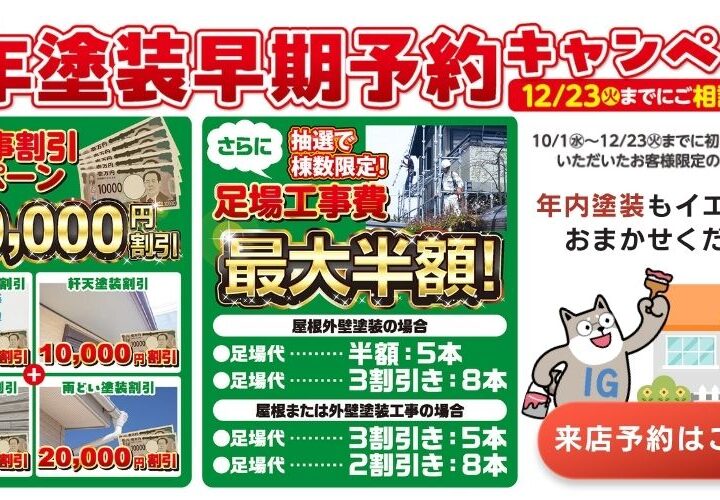 【最大半額のチャンス!】イエガードの早期予約キャンペーンで賢くリフォーム! 家を守るための屋根・外壁塗装は、計画的な実施が重要です。 今回、屋根・外壁・塗装の専門店イエガードでは、 大変お得な「早期予約キャンペーン」を実施中です。 創業1955年、創業70年を迎える地域密着の専門店、 イエガードは、お家の「本当の必要な工事」を提案する 確かな診断と全塗装専門力で安心をお届けしています。 このお得なキャンペーンの詳細をご紹介します! 1.キャンペーン期間と対象者 この早期予約キャンペーンは、10月1日(火)から12月23日(火)までの間に、 イエガードに初めてお問い合わせいただいたお客様限定です。 年内にご相談いただくことで、 来年の工事に向けて計画を立てる大きなチャンスとなります。 2.二つの柱:大幅な割引特典 今回のキャンペーンの核となる特典は、価格面での大きなメリットです。 (1) 塗装工事割引キャンペーン:最大50,000円OFF 通常の塗装工事に加え、以下の工事を組み合わせることで、割引が適用されます。 足場工事とあわせてご契約の場合:50,000円割引 軒天塗装割引:10,000円割引 シーリング工事割引:10,000円割引 雨どい塗装割引:10,000円割引 (2) 棟数限定!抽選で足場工事費が最大半額になるチャンス! この早期予約キャンペーン最大の目玉は、 足場工事費が大幅に割引となる抽選企画です。 足場代は塗装工事費用の大きな割合を占めますが、 今回の特典を利用できれば、大幅なコスト削減が期待できます。 屋根・外壁塗装の場合:足場代最大半額 屋根のみの工事の場合:足場代3割引き 外壁のみの工事の場合:足場代2割引き( 棟数が限定されていますので、 早期にご相談くださいm(__)m 3.ご来場特典も見逃せない! イエガードのショールームにご来店いただき、 アンケートにご回答いただいた方には、 スコッティティッシュ5箱組1セットプレゼント! 無料見積もりや 実物を見て安心・納得したい方は、 ぜひショールームへお越しください。 4.イエガードが提供する安心の品質 イエガードは、屋根・外壁・塗装の専門家として、 お客様の住宅を徹底的に診断し、 「本当に必要な工事」だけを提案することをモットーとしています 5.まとめ 「早期予約キャンペーン」は、 期間が12月23日(火)までと迫っています。 特に足場代の割引抽選は、非常にお得な機会です。 塗装時期を検討されている方は、 まずはお問い合わせ・ご相談ください! 2025年10月05日 更新お知らせチラシ情報