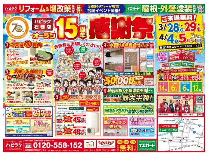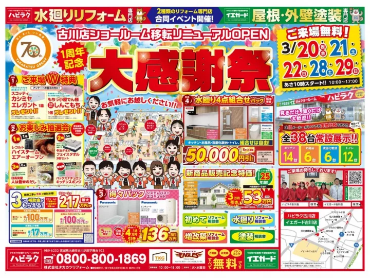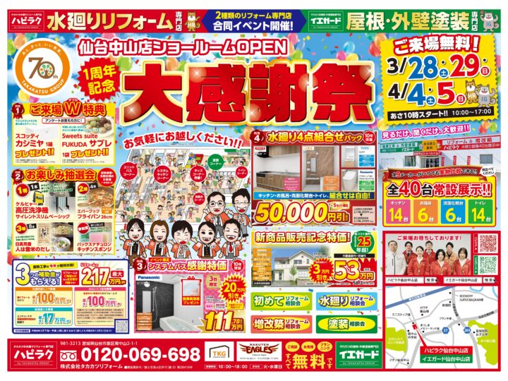 イエガード仙台中山店 1周年記念大感謝祭 3/28(土)・3/29(日) 、4/4(土)・4/5(日)の4日間!! 各日とも10:00オープン イベントならではの特典が盛りだくさん!ぜひお気軽にご来場ください! 最新水廻り設備40台常設展示! ◆キッチン:14台◆ユニットバス:6台 ◆トイレ:14台◆洗面化粧台:6台 特典1 ご来場W特典 アンケートをご記入の方にスコッティ「カシミヤエレガント」1箱&Sweets suite FUKUDA様「サブレ」1個プレゼント! 特典2 現地調査・見積依頼のお客様限定!お楽しみ抽選会 特典3 イベント限定!システムバス感謝特価 特典4 水廻り4点組合せパック ▼来店予約はこちらから▼ https://www.ieguard-takakatsu.com/showroom/#form タカカツの水廻り専門店 イエガード仙台中山店 開催日 / 3/28(土)・3/29(日) 、4/4(土)・4/5(日) 開催時間 / 10:00~17:00 開催場所 / 宮城県仙台市泉区南中山2-1-1 入場料 / 来場無料・駐車場無料 対応エリア / 仙台市(泉区、青葉区、宮城野区、若林区、太白区)、名取市、多賀城市、宮城郡利府町、富谷市、黒川郡大和町 2026年03月17日 更新チラシ情報